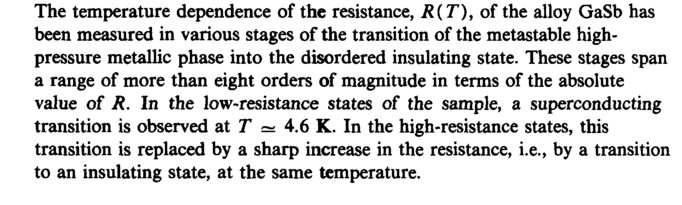 The temperature dependence of the resistance, R{ T), of the alloy GaSb has been measured in various stages of the transition of the metastable high-pressure metallic phase into the disordered insulating state. These stages span a range of more than eight orders of magnitude in terms of the absolute value of R. In the low-resistance states of the sample, a superconducting transition is observed at Τ = 4.6 К. In the high-resistance states, this transition is replaced by a sharp increase in the resistance, i.e., by a transition to an insulating state, at the same temperature.
