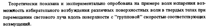 Теоретически показана и экспериментально опробована на примере волн испарения возможность избирательного возбуждения различных поверхностных волн в твердых телах при перемещении светового луча вдоль поверхности с "групповой" скоростью соответствующих возмущений.
