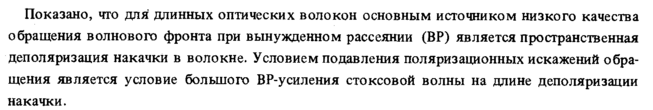 Показано, что для длинных оптических волокон основным источником низкого качества обращения волнового фронта при вынужденном рассеянии (BP) является пространственная деполяризация накачки в волокне. Условием подавления поляризационных искажений обращения является условие большого ВР-усиления стоксовой волны на длине деполяризации накачки.