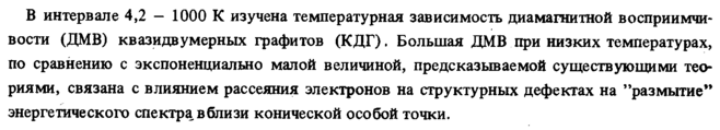 В интервале 4,2 1000 К изучена температурная зависимость диамагнитной восприимчивости (ДМВ) квазидвумерных графитов (КДГ). Большая ДМВ при низких температурах, по сравнению с экспоненциально малой величиной, предеказываемой существующими теориями, связана с влиянием рассеяния электронов на структурных дефектах на "размытие" энергетического спектра вблизи конической особой точки.