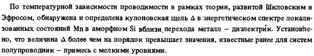 По температурной зависимости проводимости в рамках теории, развитой Шкловским и Эфросом, обнаружена и определена кулонов екая щель Δ в энергетическом спектре локализованных состояний Μη в аморфном Si вблизи перехода металл диэлектрик. Установлено, что величина Δ более чем на порядок превышает значения, известные ранее для систем полупроводник примесь с мелкими уровнями.