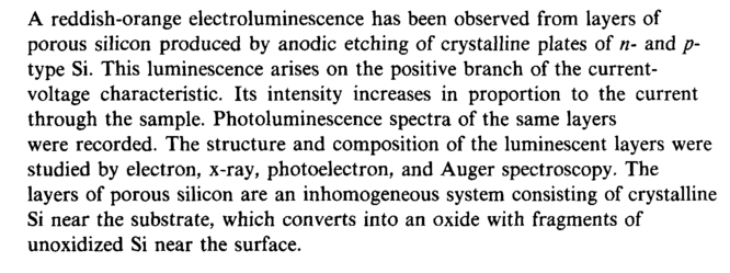 A reddish-orange electroluminescence has been observed from layers of porous silicon produced by anodic etching of crystalline plates of nand p-type Si. This luminescence arises on the positive branch of the current-voltage characteristic. Its intensity increases in proportion to the current through the sample. Photoluminescence spectra of the same layers were recorded. The structure and composition of the luminescent layers were studied by electron, x-ray, photoelectron, and Auger spectroscopy. The layers of porous silicon are an inhomogeneous system consisting of crystalline Si near the substrate, which converts into an oxide with fragments of unoxidized Si near the surface.