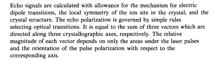 Echo signals are calculated with allowance for the mechanism for electric dipole transitions, the local symmetry of the ion site in the crystal, and the crystal structure. The echo polarization is governed by simple rules selecting optical transitions. It is equal to the sum of three vectors which are directed along three crystallographic axes, respectively. The relative magnitude of each vector depends on only the areas under the laser pulses and the orientation of the pulse polarization with respect to the corresponding axis.