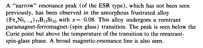 A "narrow" resonance peak (of the ESR type), which has not been seen previously, has been observed in the amorphous frustrated alloy (FeJCNi1_^)77B13Sii0 with x= 0.08. This alloy undergoes a reentrant paramagnet-ferromagnet-(spin glass) transition. The peak is seen below the Curie point but above the temperature of the transition to the reentrant-spin-glass phase. A broad magnetic-resonance line is also seen.