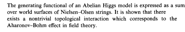 The generating functional of an Abelian Higgs model is expressed as a sum over world surfaces of Nielsen-Olsen strings. It is shown that there exists a nontrivial topological interaction which corresponds to the Aharonov-Bohm effect in field theory.