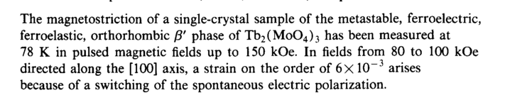 The magnetostriction of a single-crystal sample of the metastable, ferroelectric, ferroelastic, orthorhombic β' phase of Tb2(Mo04)3 has been measured at 78 К in pulsed magnetic fields up to 150 kOe. In fields from 80 to 100 kOe directed along the [100] axis, a strain on the order of 6x 10~3 arises because of a switching of the spontaneous electric polarization.