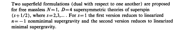 Two superfield formulations (dual with respect to one another) are proposed for free massless N= l, D=A supersymmetric theories of superspin (s+l/2), where 5=2,3,.... For s=l the first version reduces to linearized η = — I nonminimal supergravity and the second version reduces to linearized minimal supergravity.