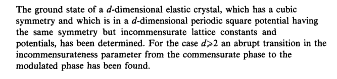 The ground state of a d-dimensional elastic crystal, which has a cubic symmetry and which is in a {/-dimensional periodic square potential having the same symmetry but incommensurate lattice constants and potentials, has been determined. For the case rf>2 an abrupt transition in the incommensurateness parameter from the commensurate phase to the modulated phase has been found.