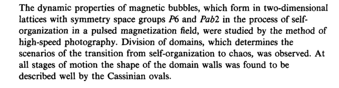 The dynamic properties of magnetic bubbles, which form in two-dimensional lattices with symmetry space groups P6 and Pabl in the process of self-organization in a pulsed magnetization field, were studied by the method of high-speed photography. Division of domains, which determines the scenarios of the transition from self-organization to chaos, was observed. At all stages of motion the shape of the domain walls was found to be described well by the Cassinian ovals.