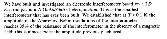 We have built and investigated an electronic interferometer based on a 2D electron gas in a AlGaAs/GaAs heterojunction. This is the smallest interferometer that has ever been built. We established that at Τ < 0.1 К the amplitude of the Aharonov-Bohm oscillations of the interferometer reaches 35% of the resistance of the interferometer in the absence of a magnetic field; this is almost twice the amplitude previously achieved.