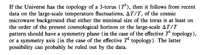 If the Universe has the topology of a 3-torus (Γ3), then it follows from recent data on the large-scale temperature fluctuations, Δ7ΥΓ, of the cosmic microwave background that either the minimal size of the torus is at least on the order of the present cosmological horizon or the large-scale Δ TV Γ pattern should have a symmetry plane (in the case of the effective Γ1 topology), or a symmetry axis (in the case of the effective Γ2 topology). The latter possibility can probably be ruled out by the data.