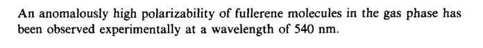 An anomalously high polarizability of fullerene molecules in the gas phase has been observed experimentally at a wavelength of 540 nm.