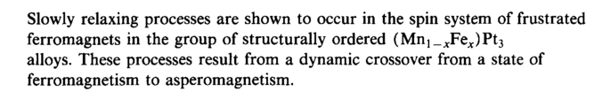 Slowly relaxing processes are shown to occur in the spin system of frustrated ferromagnets in the group of structurally ordered (Mn1_-tFe^)Pt3 alloys. These processes result from a dynamic crossover from a state of ferromagnetism to asperomagnetism.