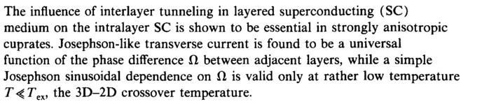 The influence of interlayer tunneling in layered superconducting (SC) medium on the intralayer SC is shown to be essential in strongly anisotropic cuprates. Josephson-like transverse current is found to be a universal function of the phase difference Ω between adjacent layers, while a simple Josephson sinusoidal dependence on Ω is valid only at rather low temperature T4,Tev the 3D-2D crossover temperature.