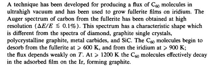 A technique has been developed for producing a flux of C^o molecules in ultrahigh vacuum and has been used to grow fullerite films on iridium. The Auger spectrum of carbon from the fullerite has been obtained at high resolution (Δ.Ε/Ε % 0.1%). This spectrum has a characteristic shape which is different from the spectra of diamond, graphite single crystals, polycrystalline graphite, metal carbides, and SiC. The Сбо molecules begin to desorb from the fullerite at > 600 K, and from the iridium at > 900 K; the flux depends weakly on T. At > 1200 К the molecules effectively decay in the adsorbed film on the Ir, forming graphite.