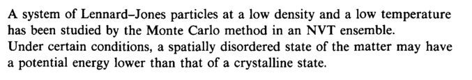A system of Lennard-Jones particles at a low density and a low temperature has been studied by the Monte Carlo method in an NVT ensemble. Under certain conditions, a spatially disordered state of the matter may have a potential energy lower than that of a crystalline state.