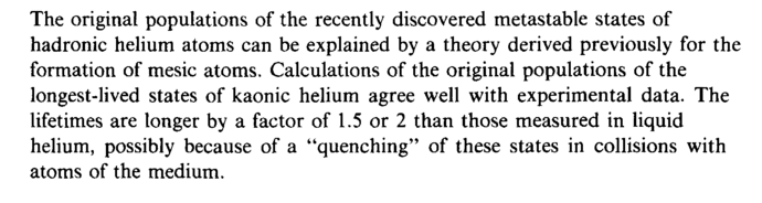 The original populations of the recently discovered metastable states of hadronic helium atoms can be explained by a theory derived previously for the formation of mesic atoms. Calculations of the original populations of the longest-lived states of kaonic helium agree well with experimental data. The lifetimes are longer by a factor of 1.5 or 2 than those measured in liquid helium, possibly because of a "quenching" of these states in collisions with atoms of the medium.
