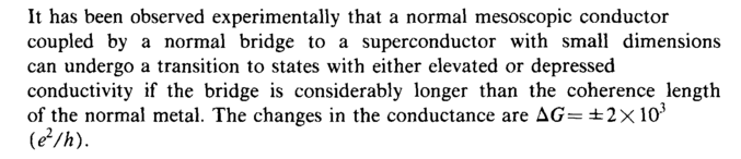 It has been observed experimentally that a normal mesoscopic conductor coupled by a normal bridge to a superconductor with small dimensions can undergo a transition to states with either elevated or depressed conductivity if the bridge is considerably longer than the coherence length of the normal metal. The changes in the conductance are AG = ±2χ 103 (e2/h).
