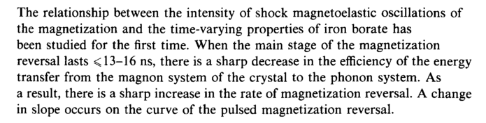 The relationship between the intensity of shock magnetoelastic oscillations of the magnetization and the time-varying properties of iron borate has been studied for the first time. When the main stage of the magnetization reversal lasts < 13-16 ns, there is a sharp decrease in the efficiency of the energy transfer from the magnon system of the crystal to the phonon system. As a result, there is a sharp increase in the rate of magnetization reversal. A change in slope occurs on the curve of the pulsed magnetization reversal.