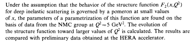 Under the assumption that the behavior of the structure function F2(x,Q1) for deep inelastic scattering is governed by a pomeron at small values of x, the parameters of a parametrization of this function are found on the basis of data from the NMC group at ζ)2 =5 GeV2. The evolution of the structure function toward larger values of Q1 is calculated. The results are compared with preliminary data obtained at the HERA accelerator.