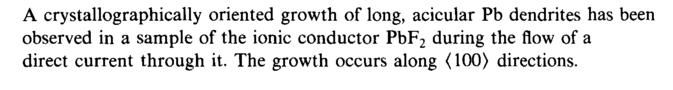 A crystallographically oriented growth of long, acicular Pb dendrites has been observed in a sample of the ionic conductor PbF2 during the flow of a direct current through it. The growth occurs along (100) directions.