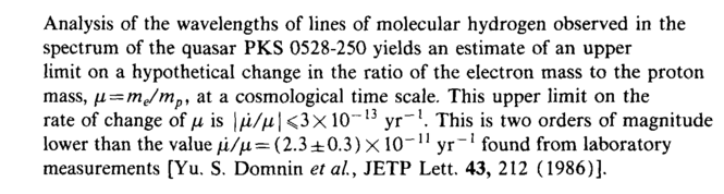 Analysis of the wavelengths of lines of molecular hydrogen observed in the spectrum of the quasar PKS 0528-250 yields an estimate of an upper limit on a hypothetical change in the ratio of the electron mass to the proton mass, /z = /?2e/wpt at a cosmological time scale. This upper limit on the rate of change of μ is \μ/μ\ <3χ 10~13 yr~l. This is two orders of magnitude lower than the value μ/μ — (2.3±0.3) X 10~n yr_I found from laboratory measurements [Yu. S. Domnin et aly JETP Lett 43, 212 (1986)].