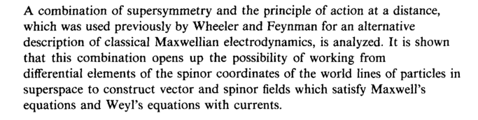 A combination of supersymmetry and the principle of action at a distance, which was used previously by Wheeler and Feynman for an alternative description of classical Maxwellian electrodynamics, is analyzed. It is shown that this combination opens up the possibility of working from differential elements of the spinor coordinates of the world lines of particles in superspace to construct vector and spinor fields which satisfy Maxwell's equations and Weyl's equations with currents.