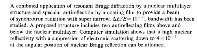 A combined application of resonant Bragg diffraction by a nuclear multilayer structure and specular antireflection by a coating film to provide a beam of synchrotron radiation with super narrow, ΔΕ/Ε= 10~u, bandwidth has been studied. A proposed structure includes two antireflecting films above and below the nuclear multilayer. Computer simulation shows that a high nuclear reflectivity with a suppression of electronic scattering down to 4x 10~7 at the angular position of nuclear Bragg reflection can be attained.