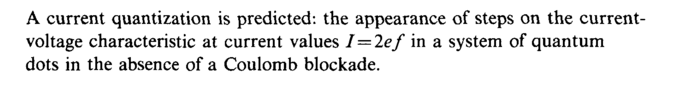 A current quantization is predicted: the appearance of steps on the current-voltage characteristic at current values I=2ef in a system of quantum dots in the absence of a Coulomb blockade.