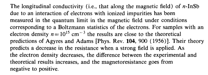 The longitudinal conductivity (i.e., that along the magnetic field) of л-InSb due to an interaction of electrons with ionized impurities has been measured in the quantum limit in the magnetic field under conditions corresponding to a Boltzmann statistics of the electrons. For samples with an electron density n= 1015 cm~3 the results are close to the theoretical predictions of Agyres and Adams [Phys. Rev. 104, 900 (1956)]. Their theory predicts a decrease in the resistance when a strong field is applied. As the electron density decreases, the difference between the experimental and theoretical results increases, and the magnetoresistance goes from negative to positive.