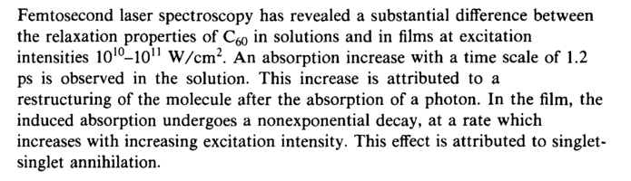 Femtosecond laser spectroscopy has revealed a substantial difference between the relaxation properties of C60 in solutions and in films at excitation intensities 1010-10n W/cm2. An absorption increase with a time scale of 1.2 ps is observed in the solution. This increase is attributed to a restructuring of the molecule after the absorption of a photon. In the film, the induced absorption undergoes a nonexponential decay, at a rate which increases with increasing excitation intensity. This effect is attributed to singlet-singlet annihilation.