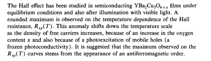 The Hall effect has been studied in semiconducting õ÷Á2óÉÚ06+È films under equilibrium conditions and also after illumination with visible light. A rounded maximum is observed on the temperature dependence of the Hall resistance, Rxy(T). This anomaly shifts down the temperature scale as the density of free carriers increases, because of an increase in the oxygen content χ and also because of a photoexcitation of mobile holes (a frozen photoconductivity). It is suggested that the maximum observed on the Rxy(T) curves stems from the appearance of an antiferromagnetic order.