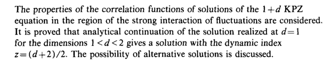 The properties of the correlation functions of solutions of the l-{-d KPZ equation in the region of the strong interaction of fluctuations are considered. It is proved that analytical continuation of the solution realized at d= 1 for the dimensions 1 < d < 2 gives a solution with the dynamic index z=(d-\-2)/2. The possibility of alternative solutions is discussed.
