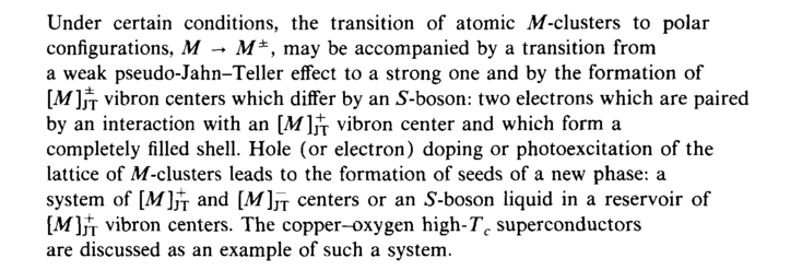 Under certain conditions, the transition of atomic Af-clusters to polar configurations, Μ -» Μ*, may be accompanied by a transition from a weak pseudo-Jahn-Teller effect to a strong one and by the formation of [M]fT vibron centers which differ by an 5-boson: two electrons which are paired by an interaction with an vibron center and which form a completely filled shell. Hole (or electron) doping or photoexcitation of the lattice of M-clusters leads to the formation of seeds of a new phase: a system of [M]jj and [M]jj centers or an s-boson liquid in a reservoir of [M]jx vibron centers. The copper-oxygen high-Гс superconductors are discussed as an example of such a system.