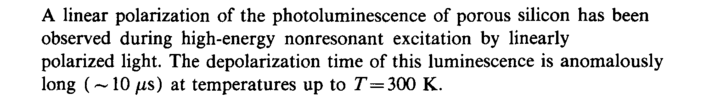 A linear polarization of the photoluminescence of porous silicon has been observed during high-energy nonresonant excitation by linearly polarized light. The depolarization time of this luminescence is anomalously long (~ 10 μ%) at temperatures up to Γ=300 К.