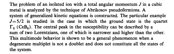 The problem of an isolated ion with a total angular momentum / in a cubic metal is analyzed by the technique of Abrikosov pseudofermions. A system of generalized kinetic equations is constructed. The particular example /=5/2 is studied in the case in which the ground state is the quartet Г8 (CeB6). The central peak in the susceptibility can be described by a sum of two Lorentzians, one of which is narrower and higher than the other. This multimode behavior is shown to be a general phenomenon when a degenerate multiplet is not a doublet and does not constitute all the states of the system.