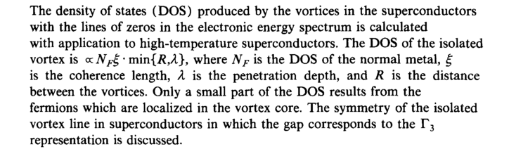 The density of states (DOS) produced by the vortices in the superconductors with the lines of zeros in the electronic energy spectrum is calculated with application to high-temperature superconductors. The DOS of the isolated vortex is κΝρξmm{R,X}, where NF is the DOS of the normal metal, ξ is the coherence length, A is the penetration depth, and R is the distance between the vortices. Only a small part of the DOS results from the fermions which are localized in the vortex core. The symmetry of the isolated vortex line in superconductors in which the gap corresponds to the Г3 representation is discussed.