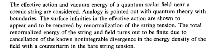The effective action and vacuum energy of a quantum scalar field near a cosmic string are considered. Analogy is pointed out with quantum theory with boundaries. The surface infinities in the effective action are shown to appear and to be removed by renormalization of the string tension. The total renormalized energy of the string and field turns out to be finite due to cancellation of the known nonintegrable divergence in the energy density of the field with a counterterm in the bare string tension.