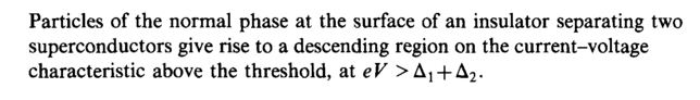 Particles of the normal phase at the surface of an insulator separating two superconductors give rise to a descending region on the current-voltage characteristic above the threshold, at eV >Δ! + Δ2.
