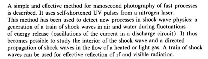 A simple and effective method for nanosecond photography of fast processes is described. It uses self-shortened UV pulses from a nitrogen laser. This method has been used to detect new processes in shock-wave physics: a generation of a train of shock waves in air and water during fluctuations of energy release (oscillations of the current in a discharge circuit). It thus becomes possible to study the interior of the shock wave and a directed propagation of shock waves in the flow of a heated or light gas. A train of shock waves can be used for effective reflection of rf and visible radiation.