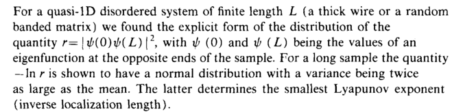 For a quasi-ID disordered system of finite length L (a thick wire or a random banded matrix) we found the explicit form of the distribution of the quantity r= \ф(0)ф(Ь) |2, with φ (0) and φ (L) being the values of an eigenfunction at the opposite ends of the sample. For a long sample the quantity — In r is shown to have a normal distribution with a variance being twice as large as the mean. The latter determines the smallest Lyapunov exponent (inverse localization length).