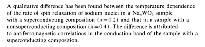 A qualitative difference has been found between the temperature dependence of the rate of spin relaxation of sodium nuclei in a NaxW03 sample with a superconducting composition (x = 0.2) and that in a sample with a nonsuperconducting composition (x = 0.4). The difference is attributed to antiferromagnetic correlations in the conduction band of the sample with a superconducting composition.