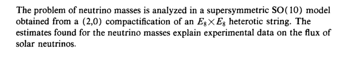 The problem of neutrino masses is analyzed in a supersymmetric SO( 10) model obtained from a (2,0) compactification of an E$XE$ heterotic string. The estimates found for the neutrino masses explain experimental data on the flux of solar neutrinos.