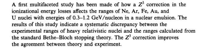 A first multifaceted study has been made of how a Z3 correction in the ionizational energy losses affects the ranges of Ne, Ar, Fe, Au, and U nuclei with energies of 0.3-1.2 GeV/nucleon in a nuclear emulsion. The results of this study indicate a systematic discrepancy between the experimental ranges of heavy relativistic nuclei and the ranges calculated from the standard Bethe-Bloch stopping theory. The Z3 correction improves the agreement between theory and experiment.