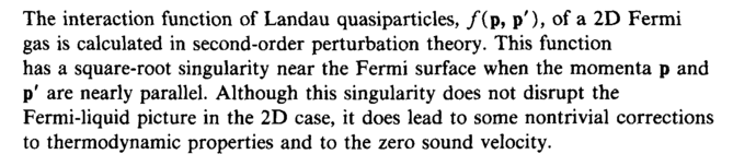 The interaction function of Landau quasiparticles, /(ρ, p'), of a 2D Fermi gas is calculated in second-order perturbation theory. This function has a square-root singularity near the Fermi surface when the momenta ρ and p' are nearly parallel. Although this singularity does not disrupt the Fermi-liquid picture in the 2D case, it does lead to some nontrivial corrections to thermodynamic properties and to the zero sound velocity.