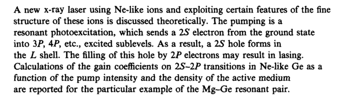 A new x-ray laser using Ne-like ions and exploiting certain features of the fine structure of these ions is discussed theoretically. The pumping is a resonant photoexcitation, which sends a 2S electron from the ground state into ÿò, áò, etc., excited sublevels. As a result, a 25 hole forms in the L shell. The filling of this hole by IP electrons may result in lasing. Calculations of the gain coefficients on 2S-2P transitions in Ne-like Ge as a function of the pump intensity and the density of the active medium are reported for the particular example of the Mg-Ge resonant pair.