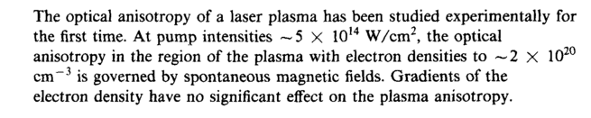 The optical anisotropy of a laser plasma has been studied experimentally for the first time. At pump intensities ~5 Χ 1014 W/cm2, the optical anisotropy in the region of the plasma with electron densities to ~2 Χ 1020 cm-3 is governed by spontaneous magnetic fields. Gradients of the electron density have no significant effect on the plasma anisotropy.