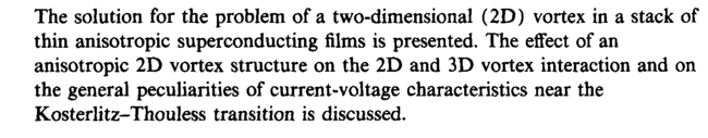 The solution for the problem of a two-dimensional (2D) vortex in a stack of thin anisotropic superconducting films is presented. The effect of an anisotropic 2D vortex structure on the 2D and 3D vortex interaction and on the general peculiarities of current-voltage characteristics near the Kosterlitz-Thouless transition is discussed.