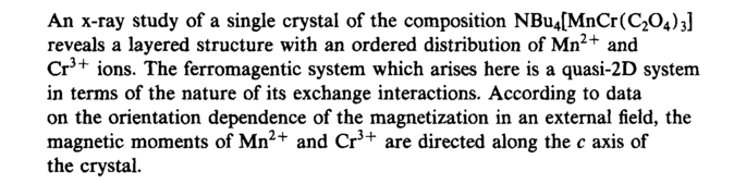 An x-ray study of a single crystal of the composition NBu4tMnCr(C204)3] reveals a layered structure with an ordered distribution of Mn2+ and Cr3+ ions. The ferromagentic system which arises here is a quasi-2D system in terms of the nature of its exchange interactions. According to data on the orientation dependence of the magnetization in an external field, the magnetic moments of Mn2+ and Cr3+ are directed along the с axis of the crystal.