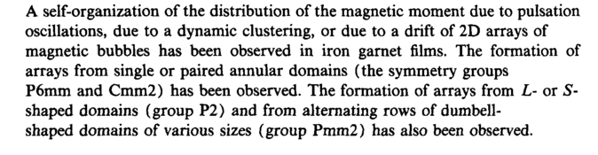 A self-organization of the distribution of the magnetic moment due to pulsation oscillations, due to a dynamic clustering, or due to a drift of 2D arrays of magnetic bubbles has been observed in iron garnet films. The formation of arrays from single or paired annular domains (the symmetry groups P6mm and Cmm2) has been observed. The formation of arrays from Lor S-shaped domains (group P2) and from alternating rows of dumbell-shaped domains of various sizes (group Pmm2) has also been observed.